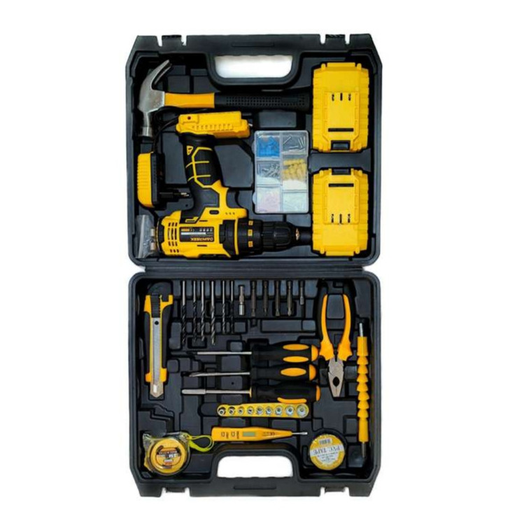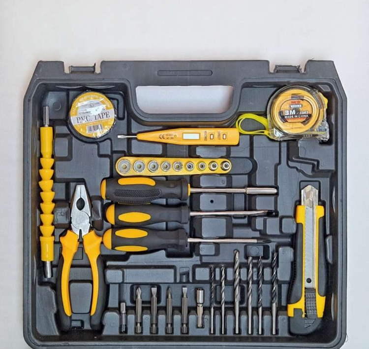 •دارای کلیه ابزارهای مصرفی شامل انبردست، چکش، بکس تک سایز 4 تا 12، متر 3 متری، پیچ گوشتی دوسو و چهارسو سایز بزرگ، پیچ گوشتی نوک خور، مته آهن سایز 5 و 6 و 8، مته دیوار سایز 5 ،6 و 8، مته برگی سایز 12 و 16، 9 عدد نوک پیچ گوشتی، تبدیل نوک پیچ گوشتی به بکس، چسب برق، کاتر، فازمتر دیجیتال، 5 عدد تیغ کاتر، مجموعه سایزبندی پیچ و رولپلاک، می باشد