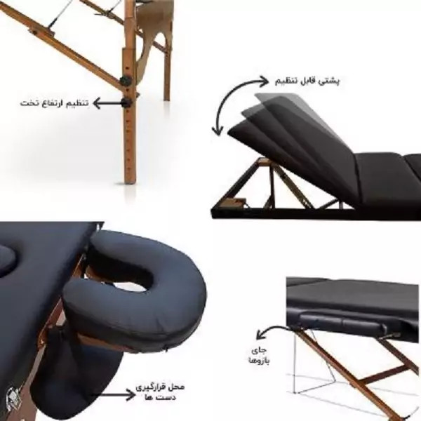 این تخت دارای پوشش قابل شستشو، قسمت پشتی قابل تنظیم، پایه های تقویت شده، قسمت استراحت دست و نگهدارنده دست و قسمت نگهدارنده صورت است.