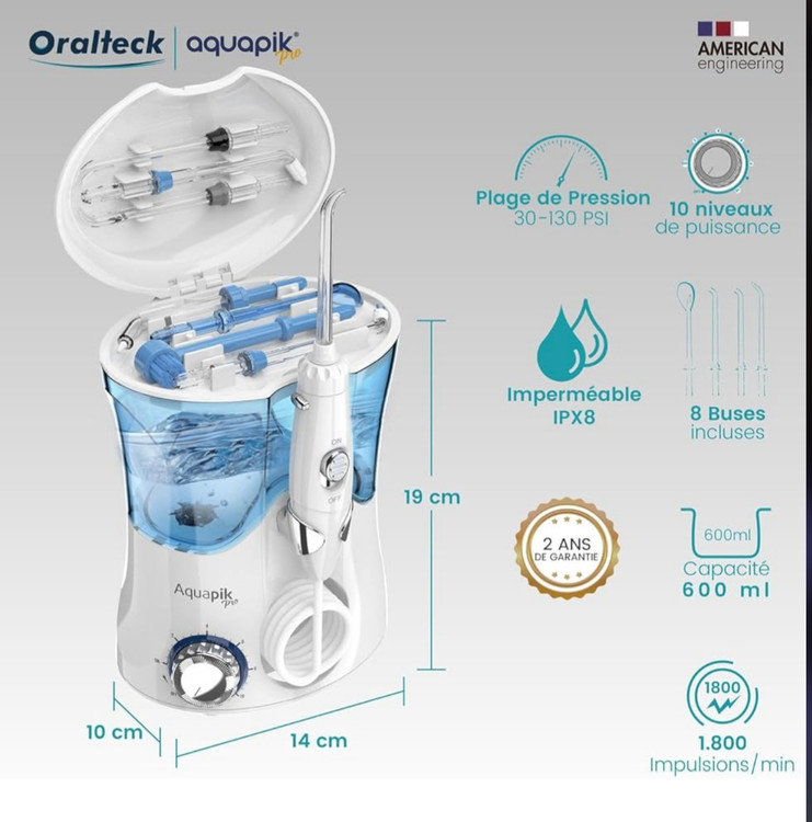 این مسواک برقی ساخت کشور کره جنوبی است و با ابعاد۲۱۰ × ۹۰ × ۱۵۰ میلیمتر به بازار عرضه شده است. ابعاد این مدل سبب شده است که این کالا برای استفاده در منزل انتخاب مناسبی باشد. آکواپیک برای این دستگاه توان ۲۴ وات را در نظر گرفته است. وزن مسواک برقی آکواپیک مدلaquapik pro گرم است. این مدل دارای مخزنی به حجم ۶۰۰ میلیلیتر است که این مقدار برای استفادههای خانگی مطلوب است. ولتاژ این کالا ۱۰۰-۲۳۰ ولت است و فرکانس آن توسط شرکت سازنده ۵۰/۶۰ هرتز اعلام شده است. این مدل مسواک برقی با فشار آب دندانها و لثه شما را تمیز خواهد کرد. فشار آب سبب میشود میان دندانتان کاملا تمیز شود و علاوه بر این برای سلامت لثه موثر است.این دستگاه یک ماساژور عالی برای لثه های شماست زیرا در هر دقیقه 1800 پالس تولید میکند. این مدل جدا از اینکه برای لثه و دندانهایتان بسیار مفید است، دارای امکانات بسیاری هم هست. این دستگاه از تکنولوژی پیشرفته بهداشت دهان و دندان به وسیله فشار آب بهره برده است.