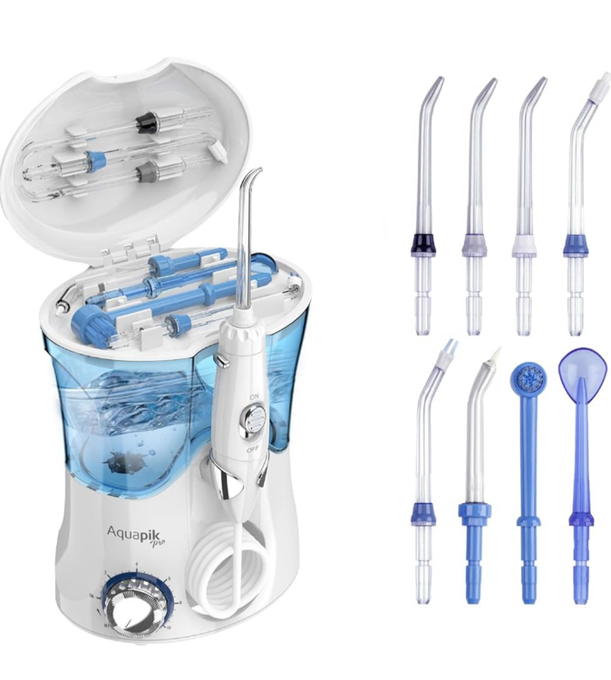 این مدل دارای ۴ سری با رنگهای متفاوت است که تمامی افراد خانواده میتوانند از آن ها استفاده کنند. از قابلیتهای این مدل میتوان به قابلیت پاشیدن آب با فشار بالا (100psi) برای پاک کردن پلاکتها و جرمهای اطراف دندان نام برد. مسواک برقی آکواپیک مدل aquapik pro برای افرادی که ارتودنسی و یا ایمپلنت دارند بسیار کارآمد است زیرا فواصل بین دندان ها را به طور کامل تمیز میکند. شما با توجه به دندان و لثهتان قادر هستید فشار آب را بر روی 12 درجه مختلف تنظیم کنید. این محصول قابلیت شستشوی دندان ها و ماساژ دادن لثه ها را برای شما فراهم میکند.