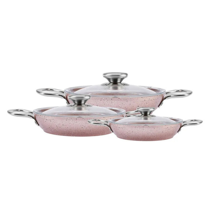 باطراحی فوق العاده بادوام و ضد خش ست ماهی تابه کم عمق بیوگرانیت نقره ای طول عمر و عملکرد اسثنایی را ارئه میدهد سطح نچسب پخت و پز بی دردسر و رها سازی آسان غذا را تضمین میکند وتمیز کردن را راحت میکند قابلیت شست و شو در ماشین ظرف شویی را دارد