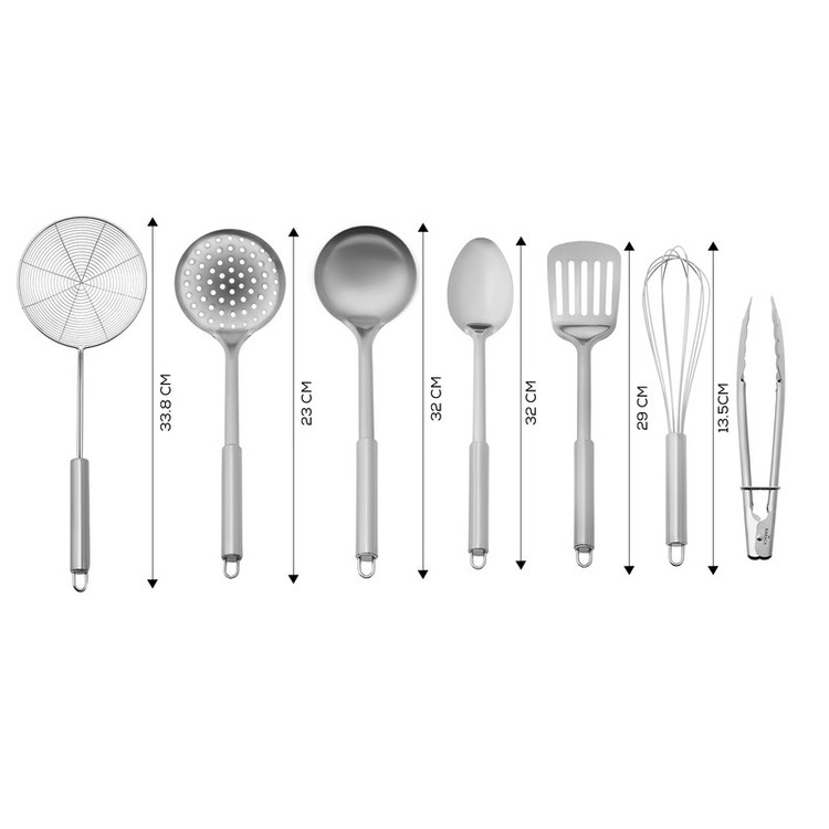 صافی 33.8 × 11.7 سانتی متر صافی 23 سانتی متر قاشق 32 سانتی متر کاردک شیار دار 29 سانتی متر همزن 13.5 سانتی متر ملاقه انبر شستشو در دست توصیه میشود
