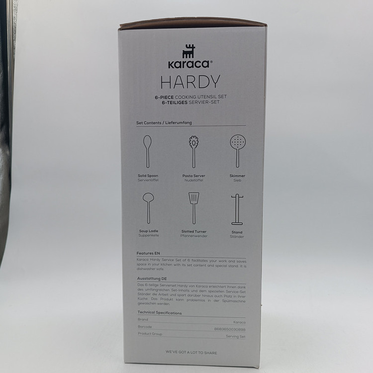 به قابلمه اسیب نمیزند قابل شستشو با ماشین ظرف شویی دارای استند شامل ملاقه و قاشق و چنگال ماکارونی و کاردک کفگیر