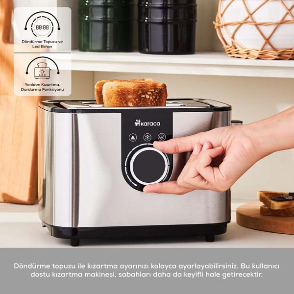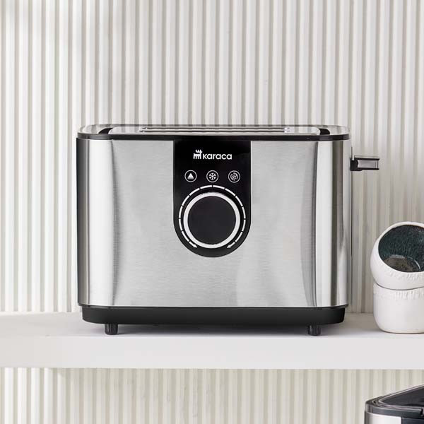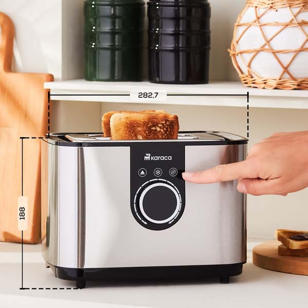 توستر Karaca Inox 2303 ویژگی ها بدنه استیل ضد زنگ با قدرت 850 وات گرم کردن مجدد عملکردهای یخ زدایی و لغو دستگیره چرخشی با کاربری آسان تمیز کردن آسان با صفحه نمایش LED تنظیم قهوه ای شدن سینی خرده نان 7 سطح